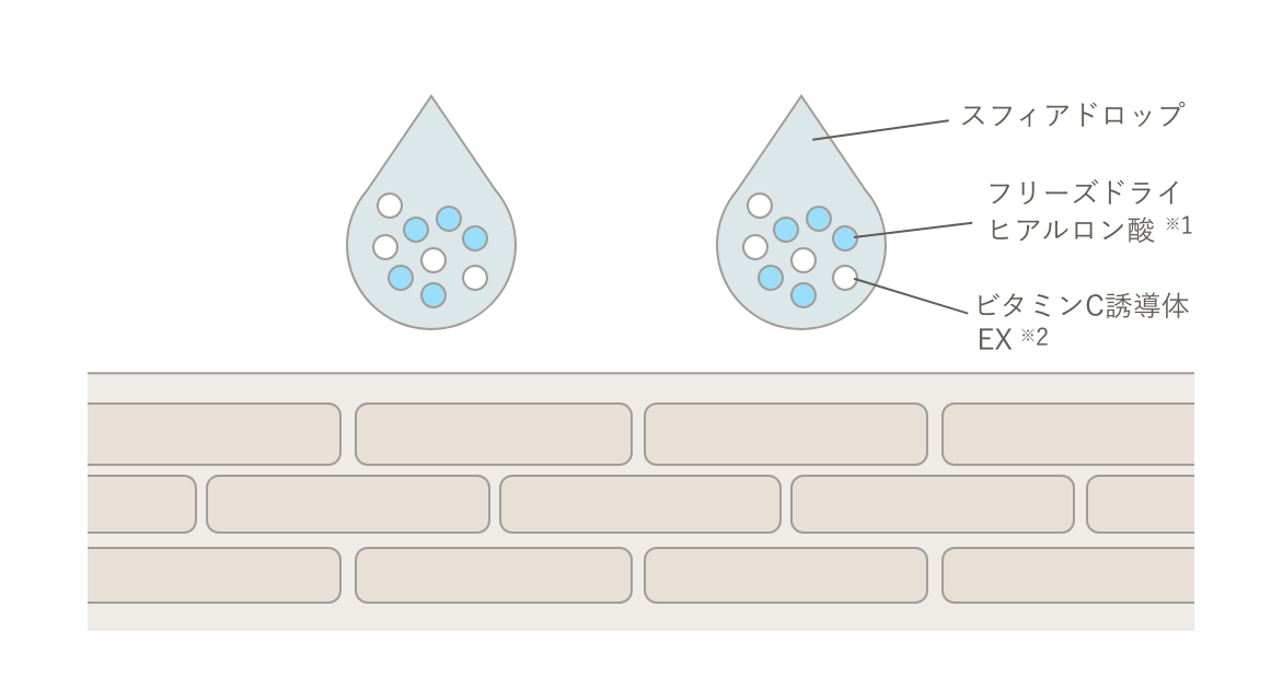 - ヒアルロン酸をいかに角質層に届けるか、という点です。ヒアルロン酸は水分の中で膨らんでしまう成分のため、化粧水やジェルの中に含ませると肌に入るサイズの粒子より、大きくなってしまいます。そこで効果的に届けるためにオイルの中に分散させて留めておく形にしました。